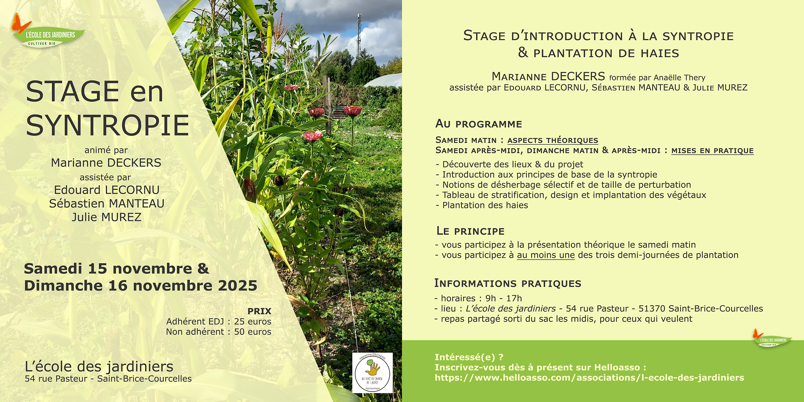 Le samedi matin, L’école des jardiniers ouvre sur inscription ses portes pour des ateliers et chantiers participatifs sur des thèmes variés : jardinage, permaculture, compostage, biodiversité, etc. Les places sont limitées à 4 personnes extérieures à l’association pour vous permettre de découvrir nos activités.